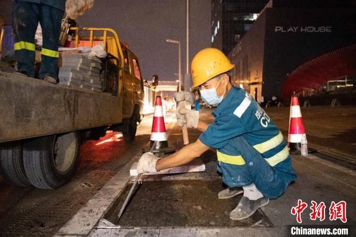 工作人员正在修补人行道井盖面砖。 成都城投 供图